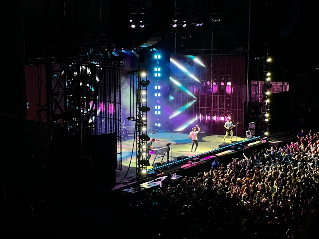 I should mention the opening act in this context. Gayle is 17 and her big hit is a viral TikTok sensation anyone under 22 has heard of. “ABCEFU.” I hadn’t, but a quick poll of the youth told me it was omni-present. But I’m not here to bash Gayle. She might be a superstar someday. Good for her. If I were Adam, Jack, and Ryan (the AJR brothers), I’d be a little annoyed by her being able to waltz onto this stadium stage at the age they say they were when they were busking and going nowhere in Washington Square Park—part of the earlier monologue, in which AJR was saying their 15-year-old selves never would have believed they would be here. Then they listed the other “smaller” shows that paved the way to this concert: Bowery Ballroom, Webster Hall, other places my band would have killed to be big enough to play at. In their narrative, they went from busking to playing those shows. (What about respectable mid-levels like The Knitting Factory, Rockwood Music Hall, or the Mercury Lounge, guys?!). But then again, Gayle went from TikTok to an arena tour with AJR. Her fifteen-year-old self was two years ago and had a romantic relationship she sang her most sensitive song about, from her debut EP, which she said she would be happily signing at the merch booth. Okay, so being the opener is different from headlining, but still…